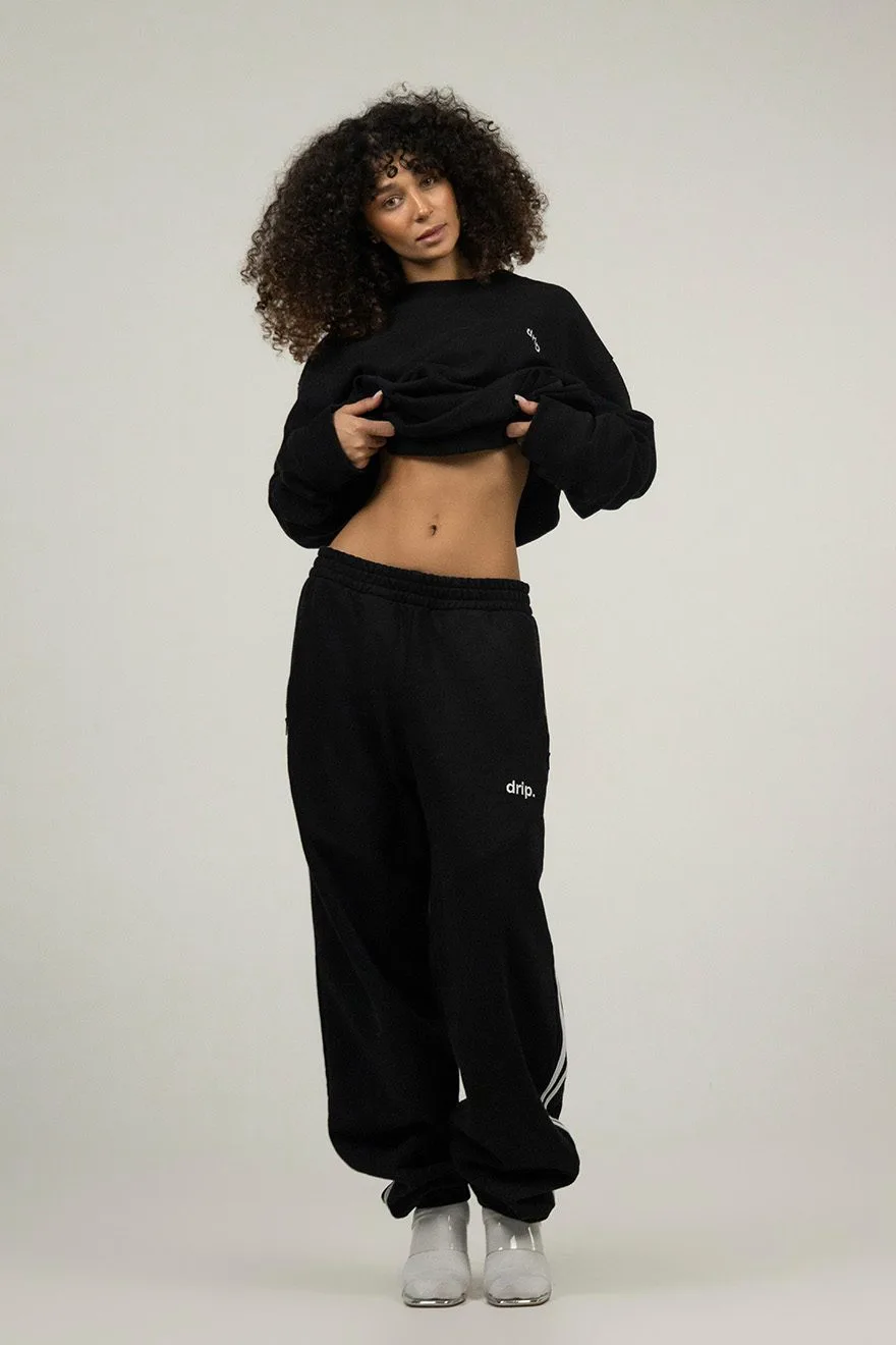 Брюки оверсайз из плотного футера 470 гр без начёса. Вышитый логотип drip. на левой брючине. Два белых лампаса по бокам. Отлично держат объемную форму. Резинки на голени.
