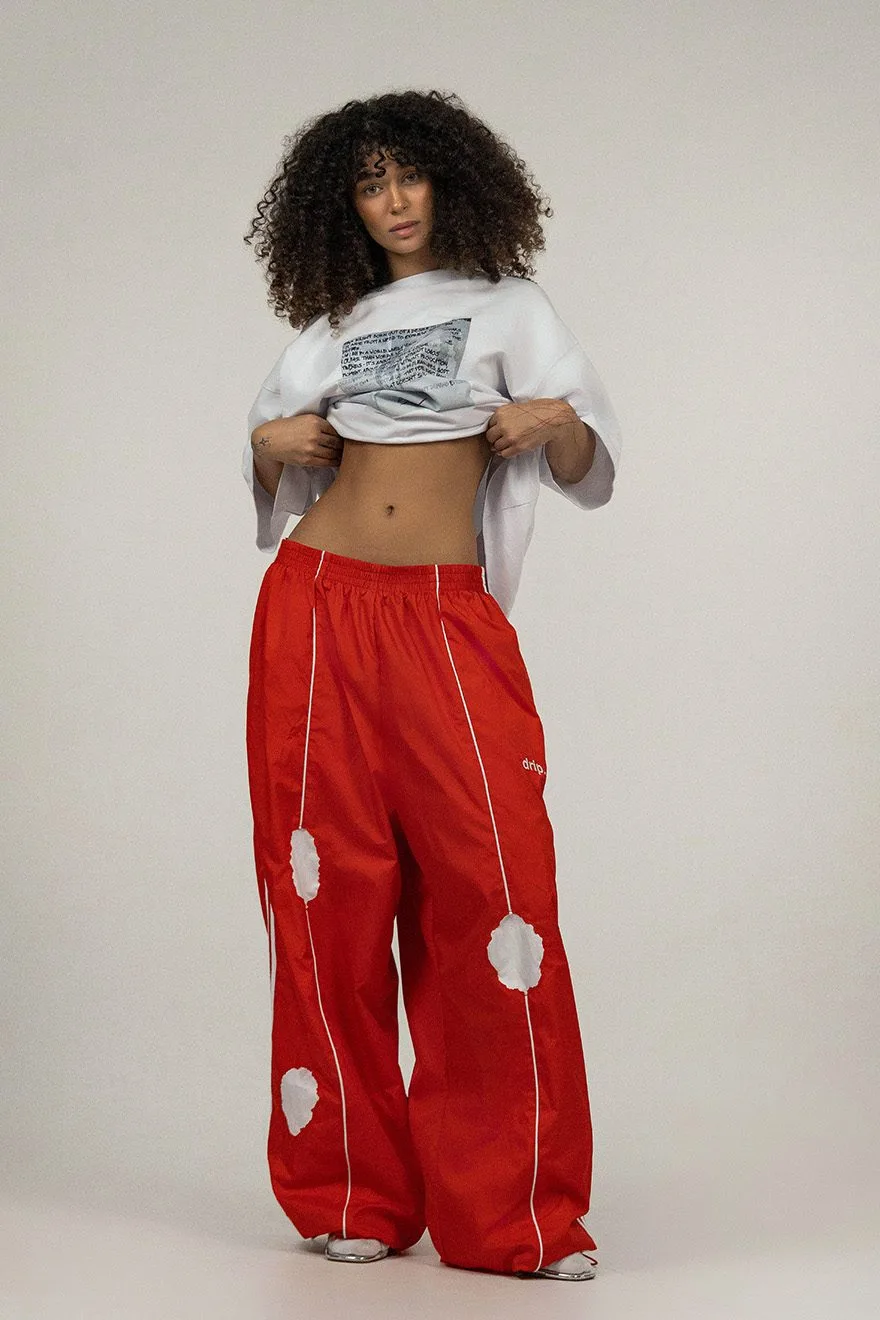 Брюки оверсайз из плащевой ткани дюспо с подкладом из белой сетки. Два белых лампаса по бокам. Вышитый логотип drip. на левой брючник. Утягивающая резинка на голени. Имитация дыр по брючинам.