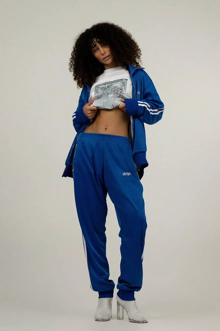 Брюки из ткани суперэластик премиум с подкладом из белой сетки. Два белых лампаса по бокам. Вышитый логотип drip. на левой брючине. Резинки на голени.