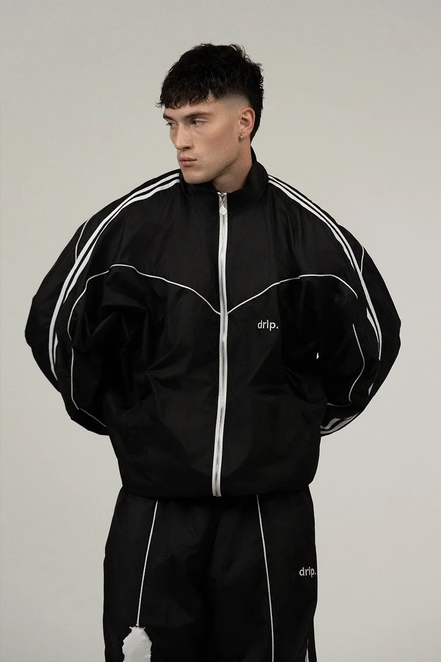 Зипка оверсайз из плащевой ткани с подкладом из белой сетки. Два белых лампаса по бокам. Вышитый логотип drip. слева на груди.